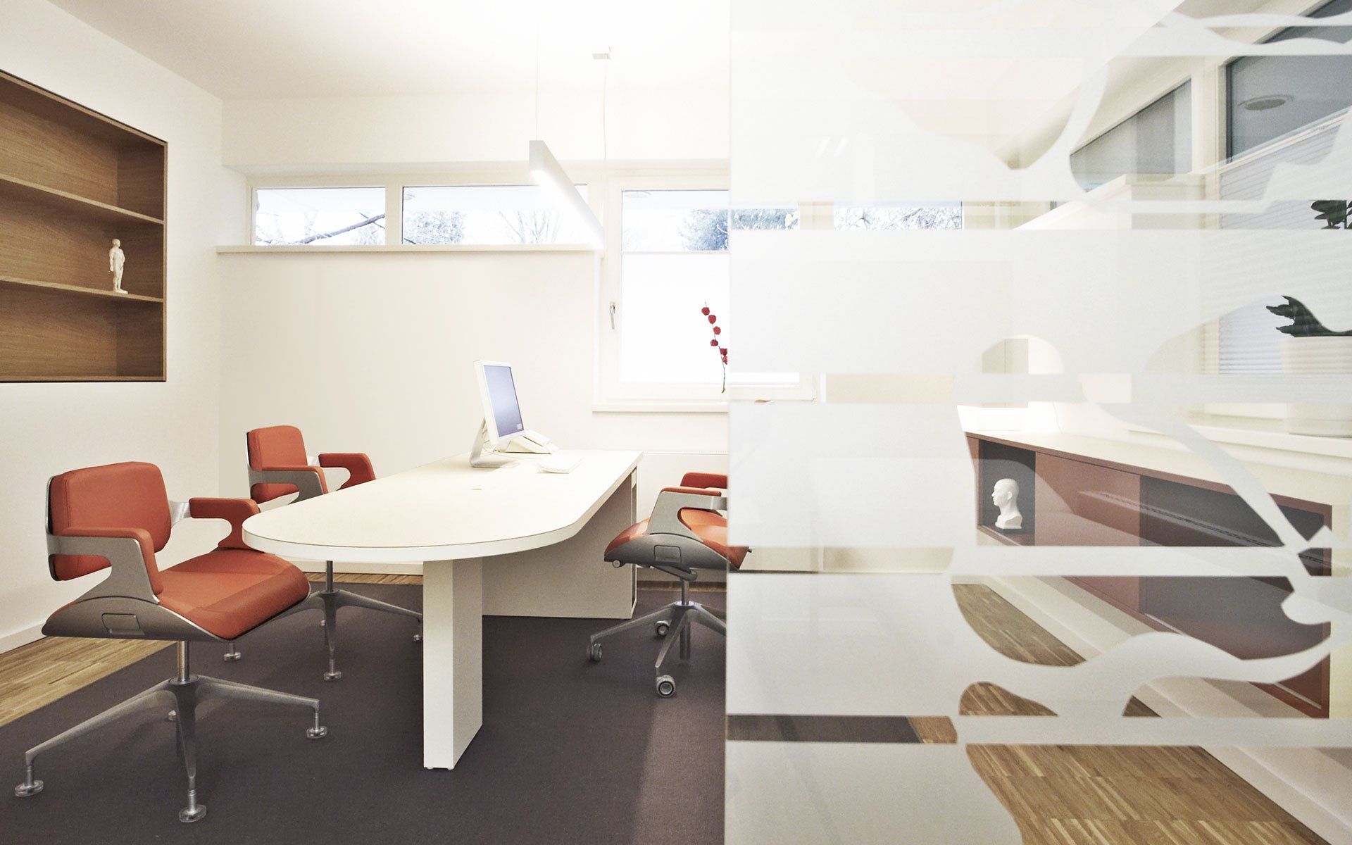 All in all, furniture and walls combine to form a spatial unit that is very clear and unambiguous in terms of form and material aesthetics. The room is emotionally charged by floral graphics made of translucent foil cuts, which sometimes run densely, sometimes loosely across the numerous floor-to-ceiling glass partitions and thus play with opacity and perspective in different ways. Strongly colored wall elements support this impression and make the new entrance area dynamic. Above all, the openness and balance of the new rooms now ensure a more relaxed visit to the doctor.