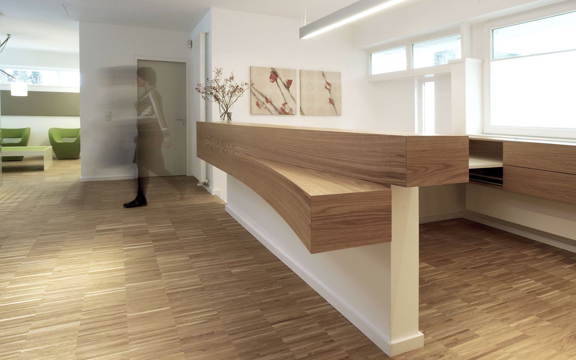 Turning 90 square meters into what feels like 150 makes it possible to restructure space. The task was to turn an outdated, spatially separated practice into a warm, inviting place for treatments and medical education. The result is a holistic and new perception of space, which is characterized by open visual references, transparency and a light environment that is unusually warm and differentiated for a doctor's office. Rooms were opened up, furniture mostly integrated into walls and materials used across rooms. The new counter is the central element between the open waiting area and the treatment area. As an elongated bar, this emphasizes the horizontal and thus optically enlarges the room.