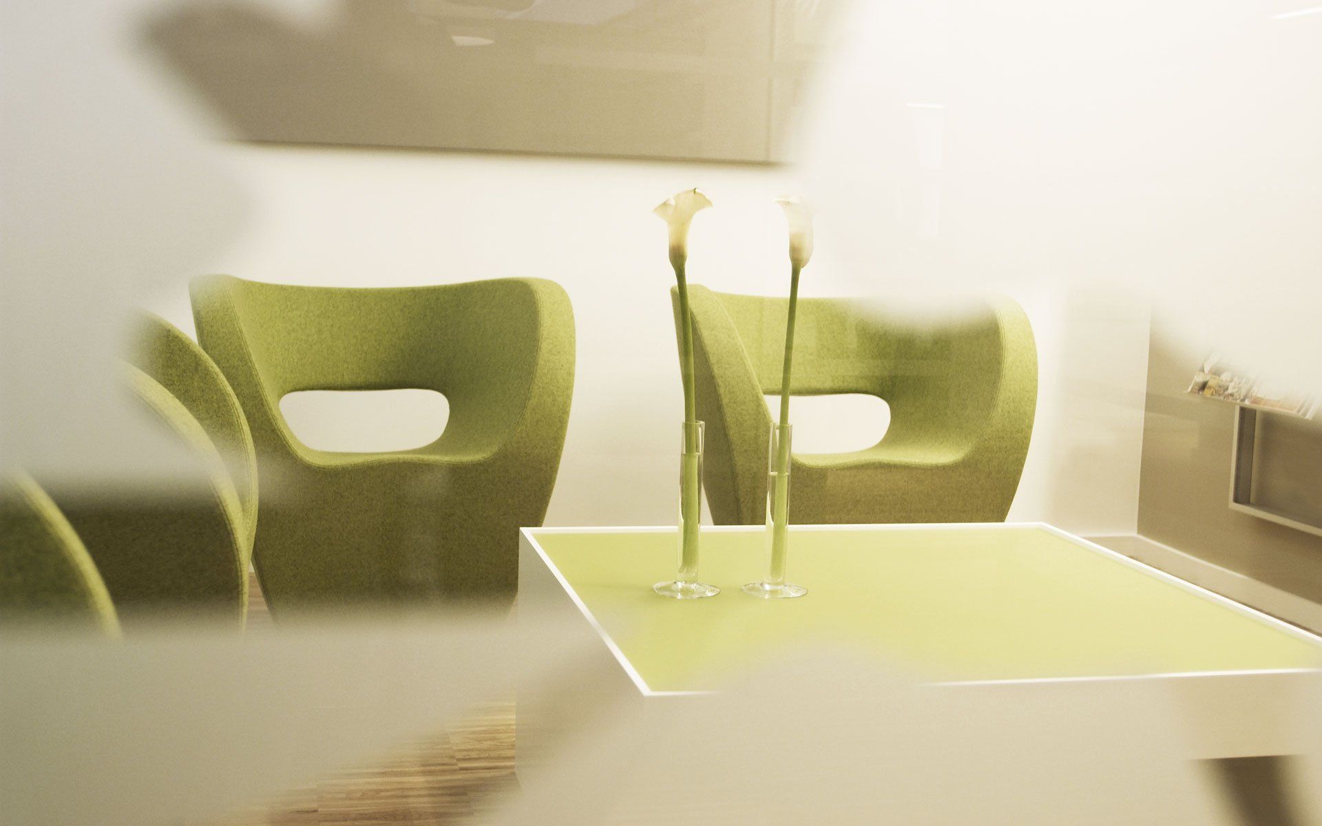 All in all, furniture and walls combine to form a spatial unit that is very clear and unambiguous in terms of form and material aesthetics. The room is emotionally charged by floral graphics made of translucent foil cuts, which sometimes run densely, sometimes loosely across the numerous floor-to-ceiling glass partitions and thus play with opacity and perspective in different ways. Strongly colored wall elements support this impression and make the new entrance area dynamic. Above all, the openness and balance of the new rooms now ensure a more relaxed visit to the doctor.